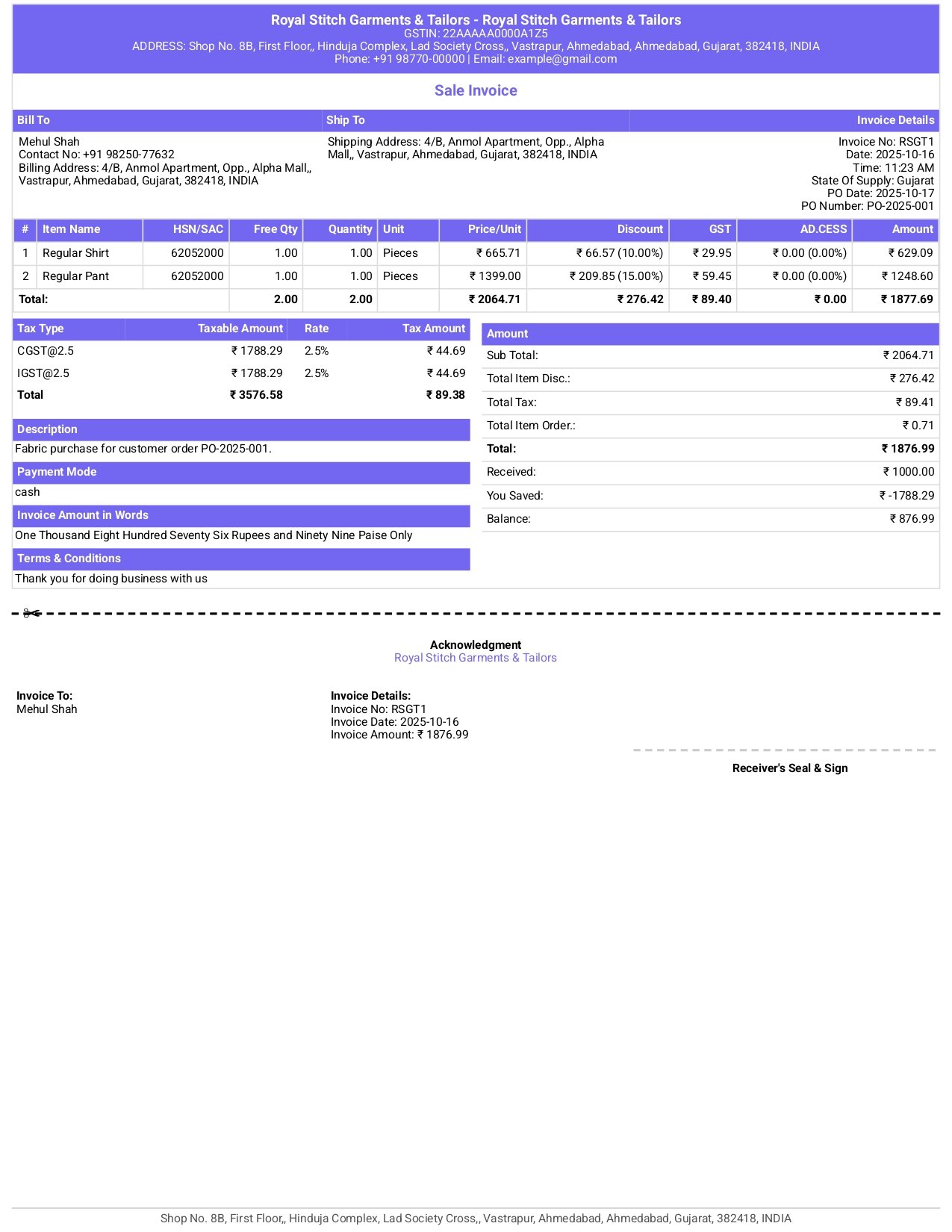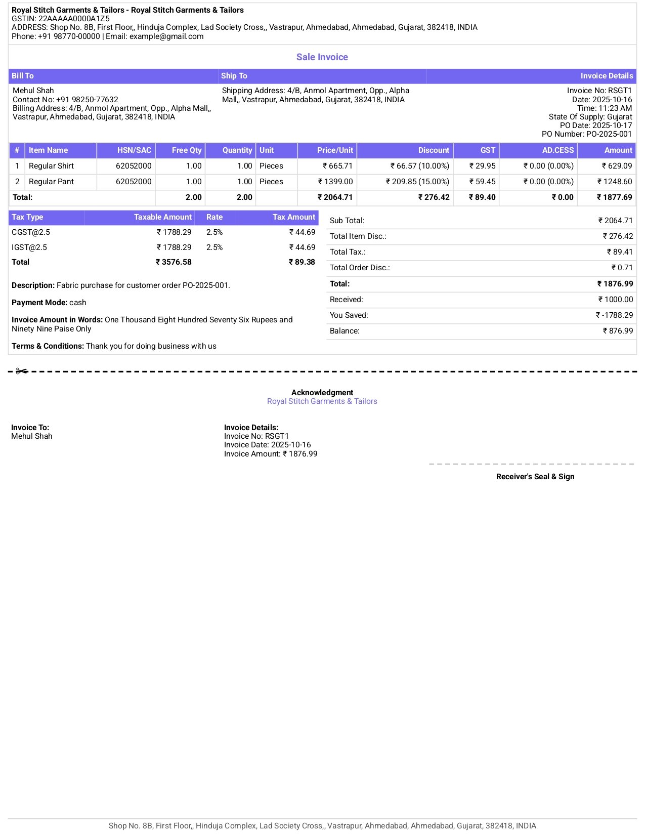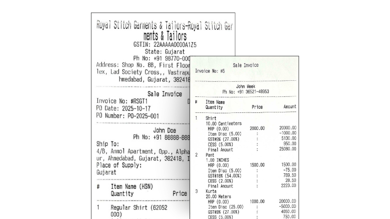 Design professional GST & non-GST invoices that match your brand. Choose from multiple themes, layouts, and colors — all inside India’s best billing software for tailors and garment shops.