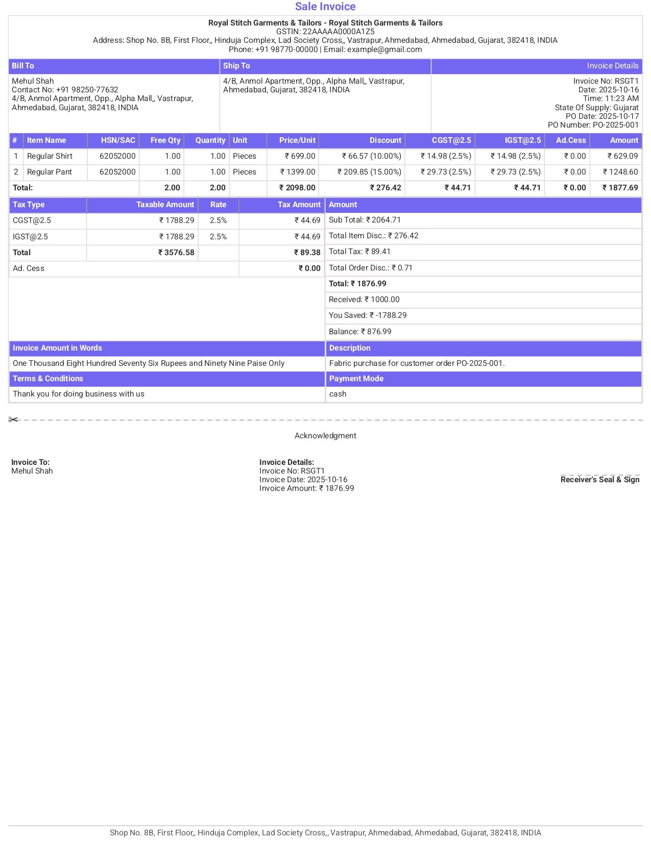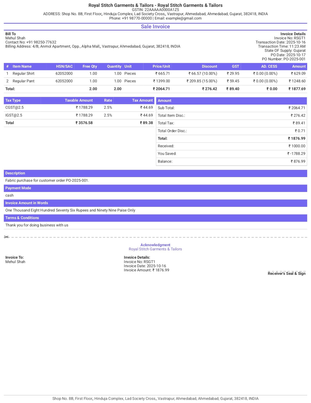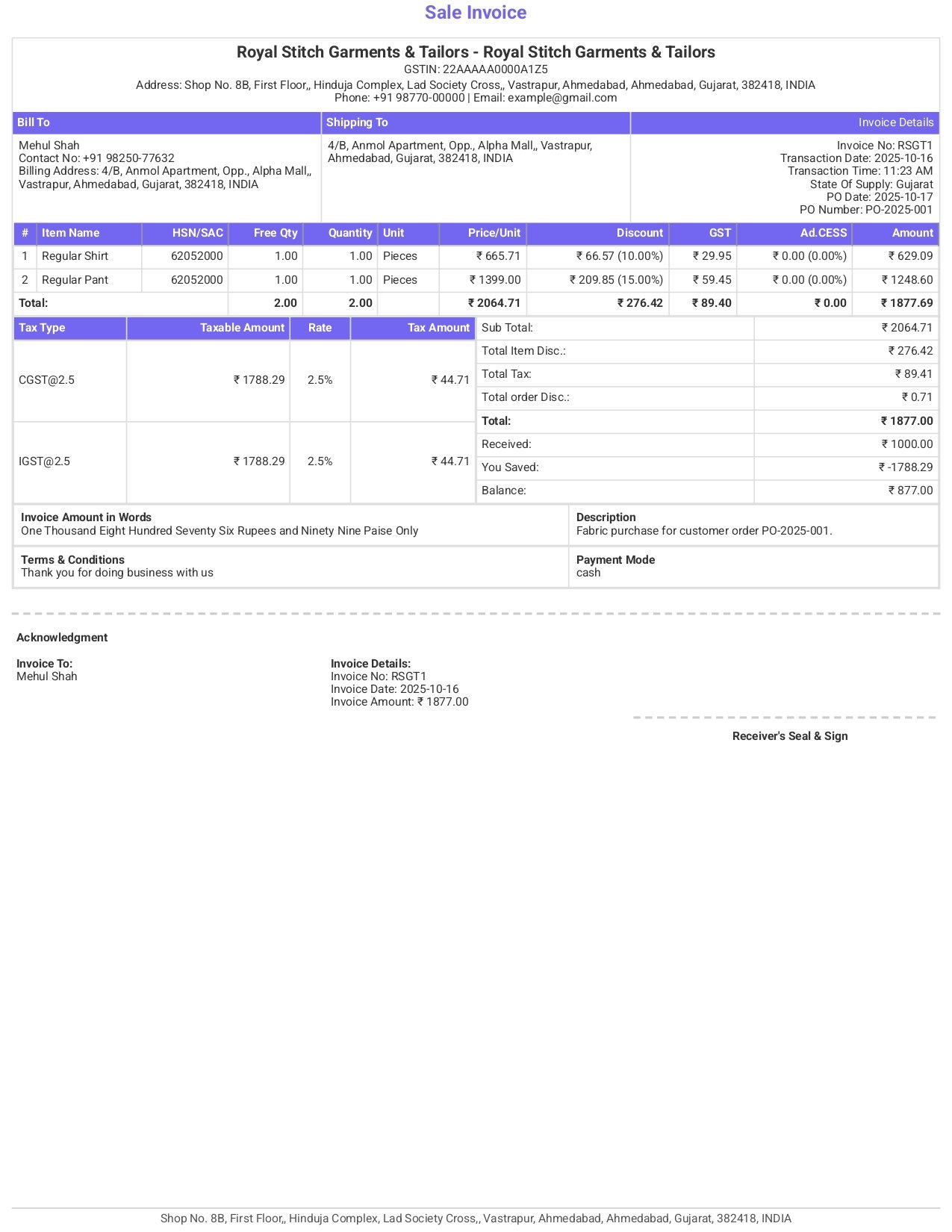 Design professional GST & non-GST invoices that match your brand. Choose from multiple themes, layouts, and colors — all inside India’s best billing software for tailors and garment shops.