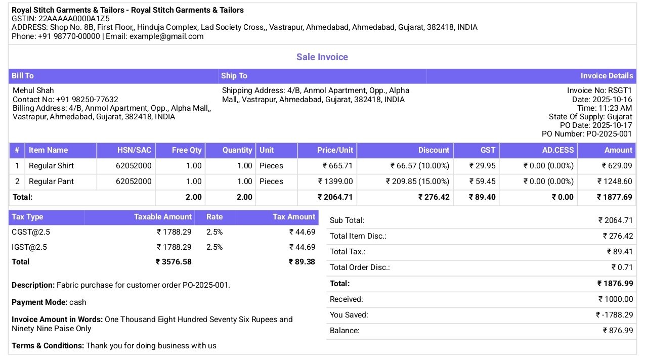 If you’re looking for the best billing software and best invoicing software for tailoring or garment businesses, the STS App is the right choice. It allows you to create invoices instantly, manage GST billing, and track payments securely. Tailors can easily print bills, manage returns, and monitor sales without technical hassle. It’s user-friendly, fast, and designed for small and growing businesses.